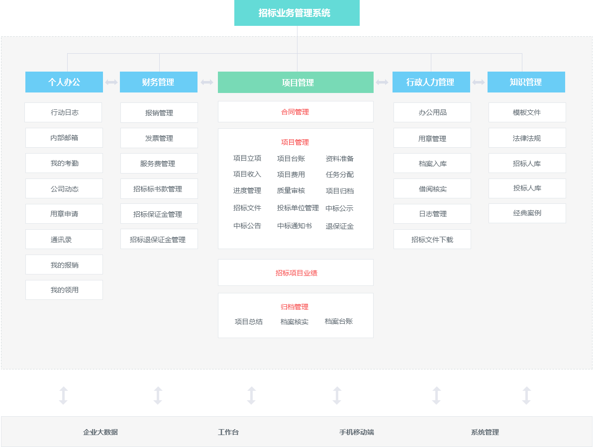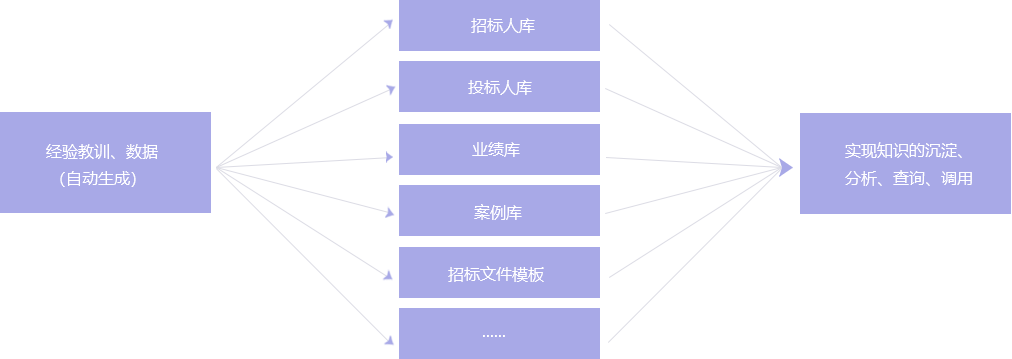 招标业务管理中的经验教训、数据自动生成招标人库、投标人库、业绩库、案例库、招标文件模板等,搭建企业知识管理平台,实现知识的沉淀、分析、查询、调用