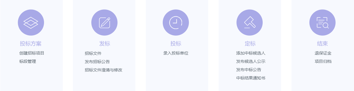 投标方案、发标、投标、定标、结果全过程网络化,实现招标方、代理方、投标方、评标专家、监管方各相关方全过程网络操作,全过程数字化、网络化、高度集成化管理